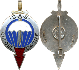 rondache argentée fond bleu marquée S.A.S. QUI OSE GAGNEparachute blanc flèche grenat le tout brochant épée | ||||