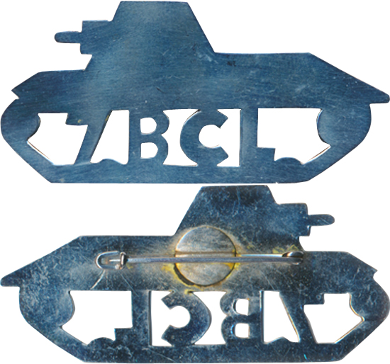 silhouette de char FCM 36, sigle 7 B.C.L. en pointe, épingle horizontale, canon long au bout arrondi, grosse pastille lisse