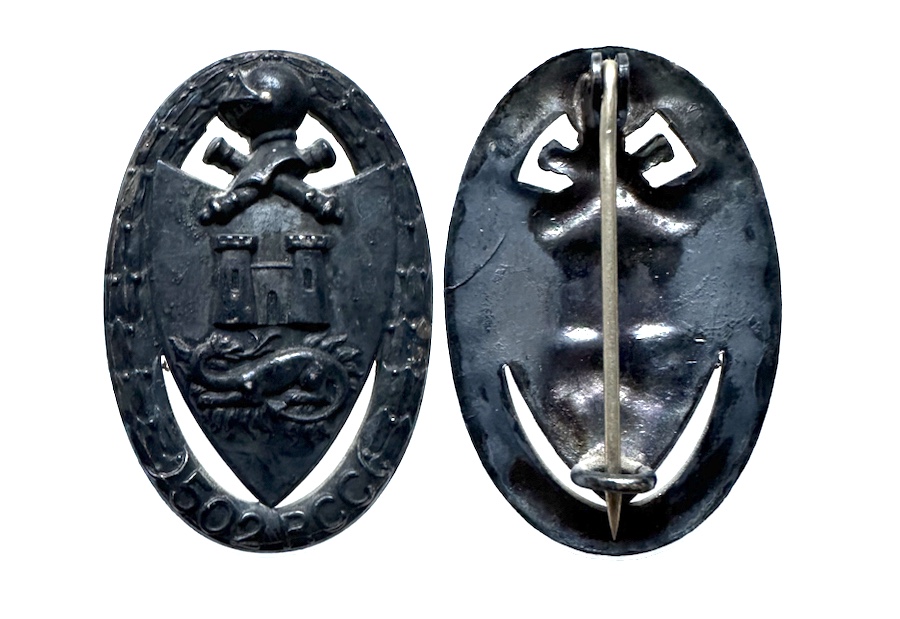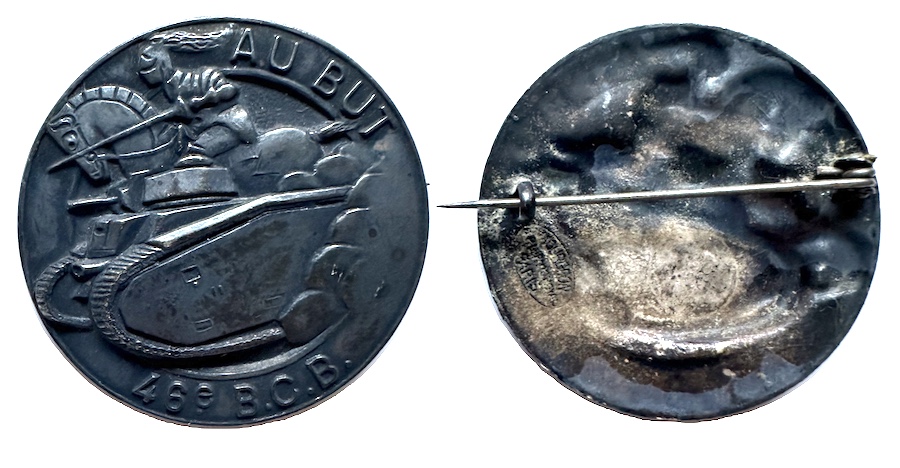 | rondache marquée AU BUT chevalier chargeant près de char sigle en pointe, estampillé Mourgeon dans un ovale, épingle à bascule | ||||