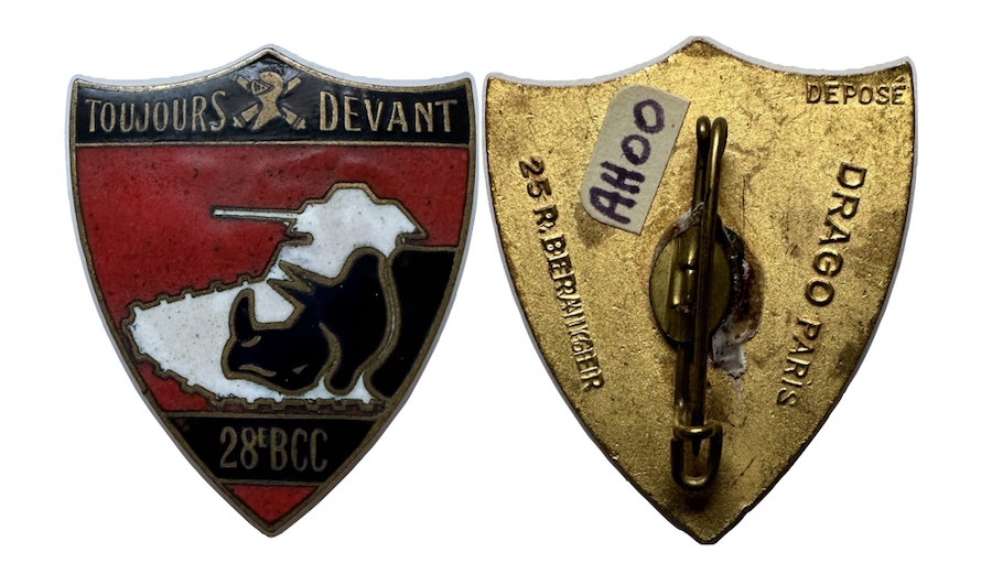 | 28° B.C.C, TOUJOURS DEVANT, char blanc, fond rouge foncé (é) | ||||