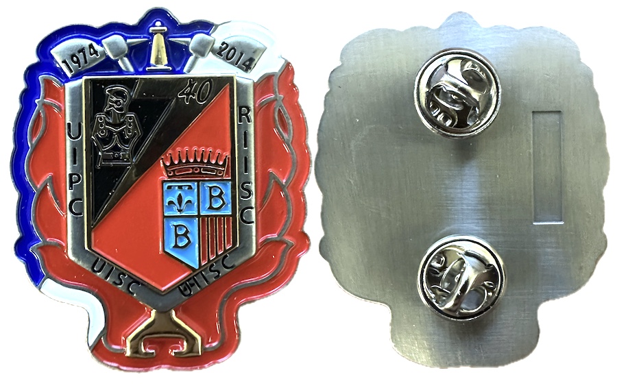 | rondache marquée AU BUT chevalier chargeant près de char sigle en pointe, estampillé Mourgeon dans un ovale, épingle à bascule | ||||