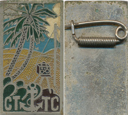 | tête de chameau blanche sommant une tête de méhariste drapée de bleu, le tout sur fond crème, cartouchières rouge brun, épingle à bascule | ||||