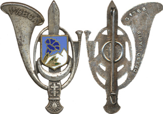| cor ovale pavillon à gauche avec 1 1 / 2 B.C.A. épée écu émaillé mont blanc fleur gentiane verte | ||||