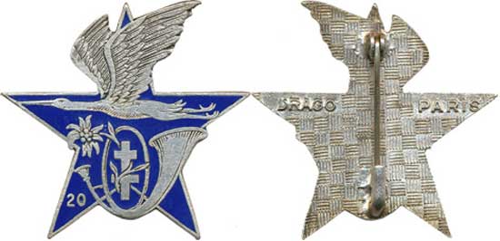 | étoile bleue brochée d’une cigogne en vol et chargée de l’insigne du 20° BCA | ||||