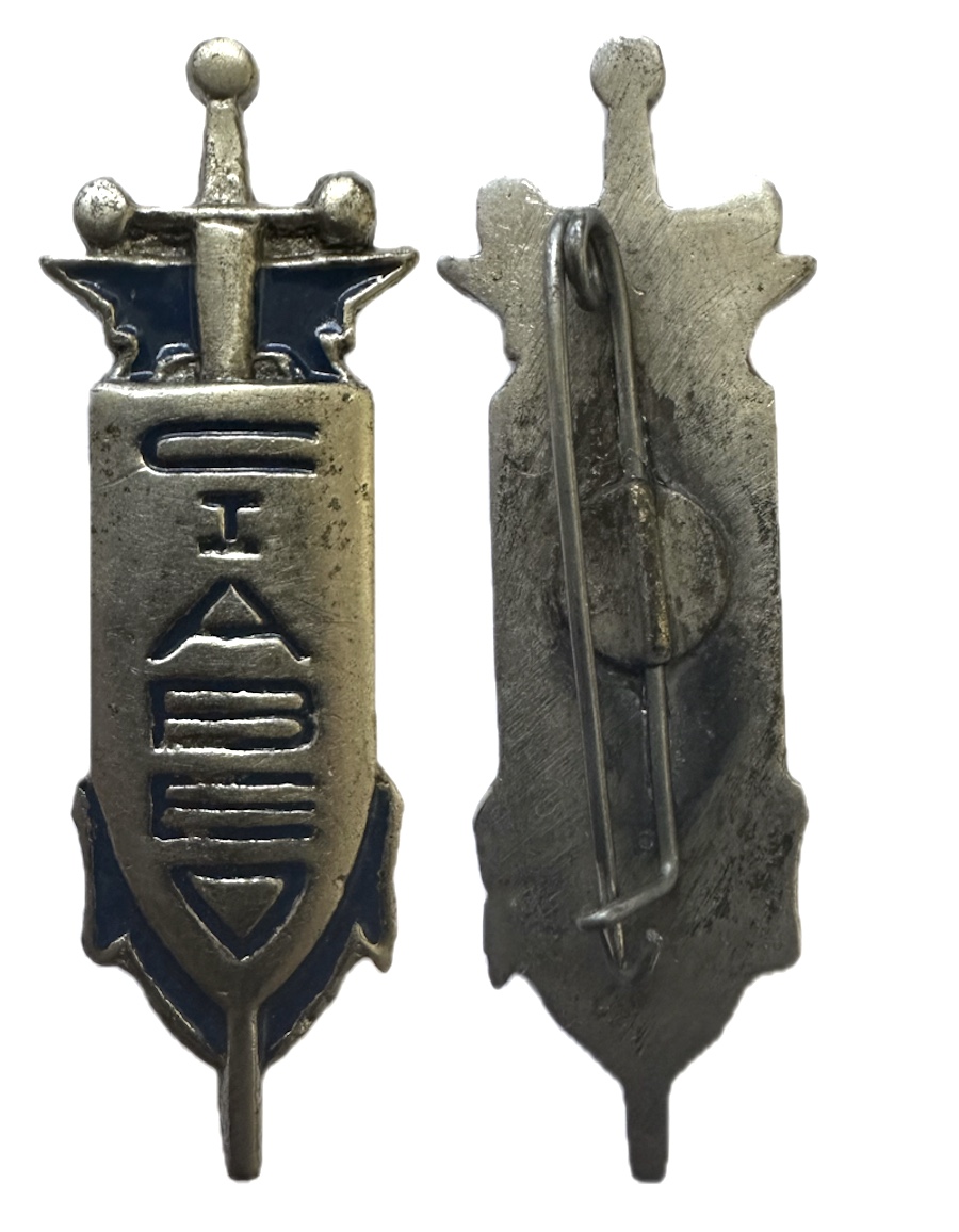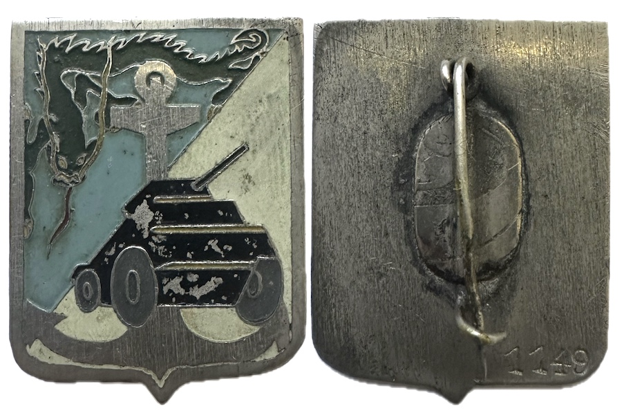 | ancre brochée d’une croix du sud Agadès bleue, chargée d’un engin blindé. EN ARGENT, PETIT ECLAT D’EMAIL | ||||