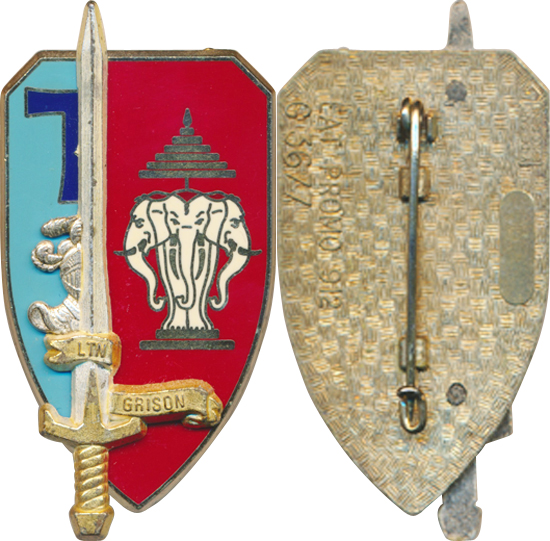 | Les bataillons Thaïs sont créés dès septembre 1946 pour relever les troupes de la frontière de Chine. rectangle aux couleurs du drapeau Thai, bleu blanc à un soleil rouge monts verts et marron fleuve bleu N - O sur ancre en pointe | ||||