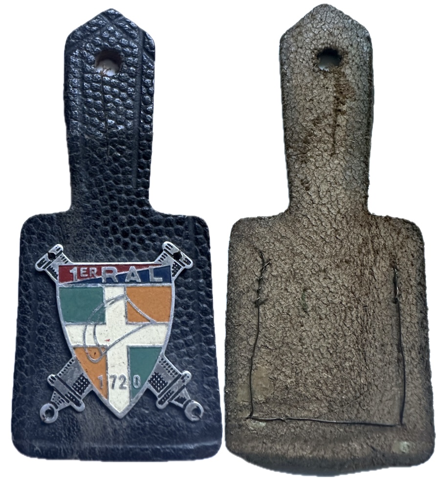 | 1° Régiment d’Artillerie Légère, métal léger, trous de couture, sur cuir | ||||