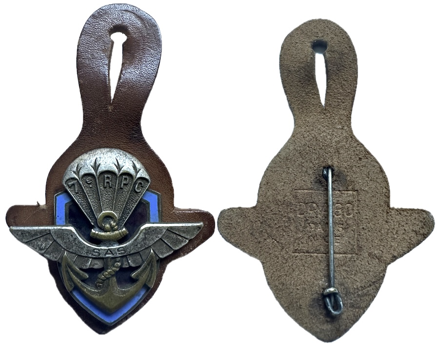 | écu rouge amarante au listel bleu, broché par parachute au sigle 7 R P C ailes au sigle S.A.S et ancre, 2 boléros gravés DRAGO PARIS | ||||