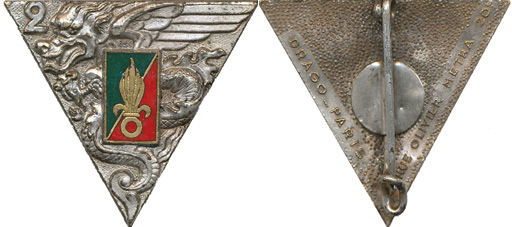 | triangle à un dragon broché d’un rectangle vert et rouge chargé d’une grenade | ||||
