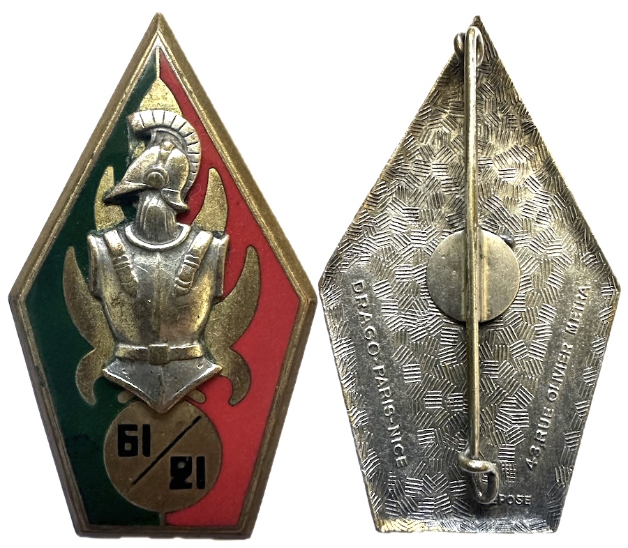 | rectangle fond bleu à un sabre, chiffre 6 et croissant sur fond rouge, pastille ajourée gravée DRAGO PARIS NICE | ||||