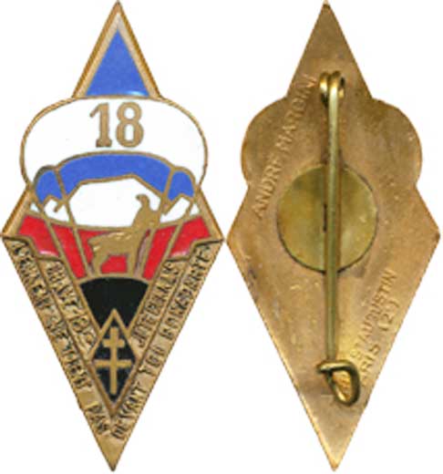 | losange doré ciel bleu mont rouge isard sur terrasse noire parachute blanc bleu au 18 croix de Lorraine sur losange noir devise en relief | ||||