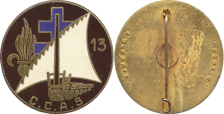 | rondache noire croix de Lorraine bleue bateau boutre voile blanche grenade nombre 13 C.C.A.S. . ATTENTION... pouvant disposer de plusieurs exemplaires de cet insigne, le numéro vu sur la photo ne sera peut être pas celui que vous allez recevoir, | ||||
